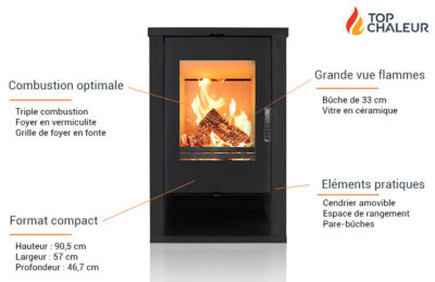 Avec une puissance de 9 kW et un rendement de 81,2 %, le poêle à bois Tixio de la marque Etna Wood est conçu pour chauffer efficacement des espaces jusqu’à 90 m². Compatible avec des bûches de 33 cm, il dispose d’un système de triple combustion réglable qui maximise chaque phase de la combustion pour un chauffage performant et écologique. Ses dimensions (H : 90,5 cm, L : 57 cm, P : 46,7 cm) lui permettent de s’intégrer dans de nombreux espaces tout en offrant une belle vision sur les flammes grâce à sa grande vitre céramique.